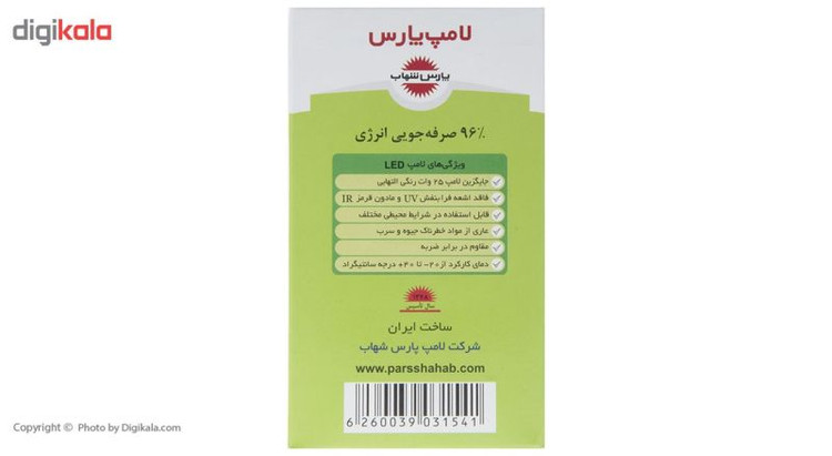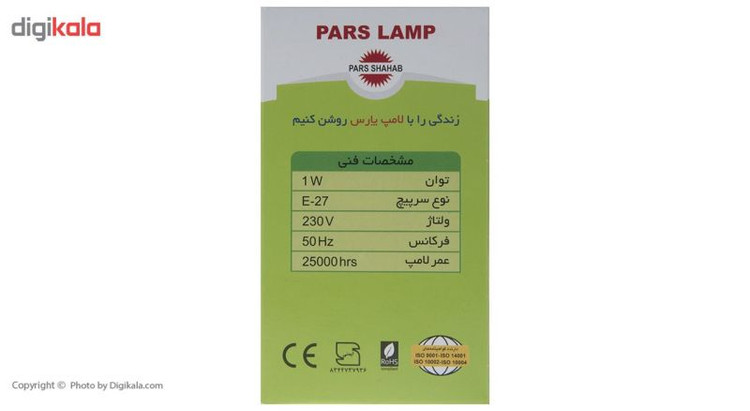 لامپ فوق محصولی از شرکت «پارس شهاب» (Pars Shahab) است و حبابی رنگی دارد. این حباب از جنس پلاستیکی مستحکم ساخته شده است و مانع از شکستن حباب در برابر ضربه میشود. این لامپ توان مصرفی بسیار کمی برابر 1 وات دارد. استفاده از لامپ فوق برای چراغ خواب و ریسههای رنگی نورپردازی بسیار مناسب است؛ زیرا مصرفی بسیار کم و نوردهی ملایمی دارند. این حباب پلاستیکی از نفوذ آب به داخل لامپ جلوگیری میکند. یک لامپ ال ای دی وظیفهی تامین نور این محصول را بر عهده دارد، از اینرو گرمای تولیدی زیادی نداشته و راندمانی بالا دارد. لامپ فوق طول عمر بالایی داشته و نور تولیدی آن فاقد اشعههای فرابنفش و مادون قرمز است. در ساخت این لامپ از عناصر خطرناکی مانند جیوه و سرب استفاده نشده است. سرپیچ این لامپ رنگی از نوع E27 (سرپیچ بزرگ) است. استفاده از این لامپ در ریسههای رنگی تاثیر بسیار زیادی در کاهش میزان مصرف برق دارد.