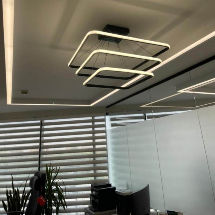 لوستر سه حلقه مربع نور از بیرون به ابعاد 30-40-50سانتیمتر ، دارای ریموت کنترل است و از امکانات ریموت میتوان به کم و زیاد کردن نور ،حالت شب و خاموش روشن کردن نور واپلیکیشن موبایل اشاره کرد همچنین شما میتوانید ارتفاع لوستر یا چیدمان شعله ها را تغییر بدهید.