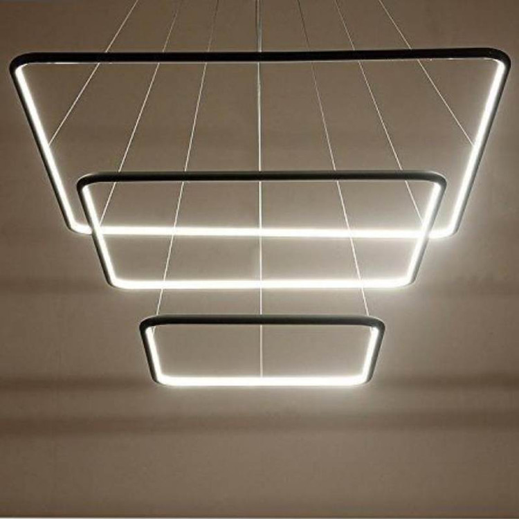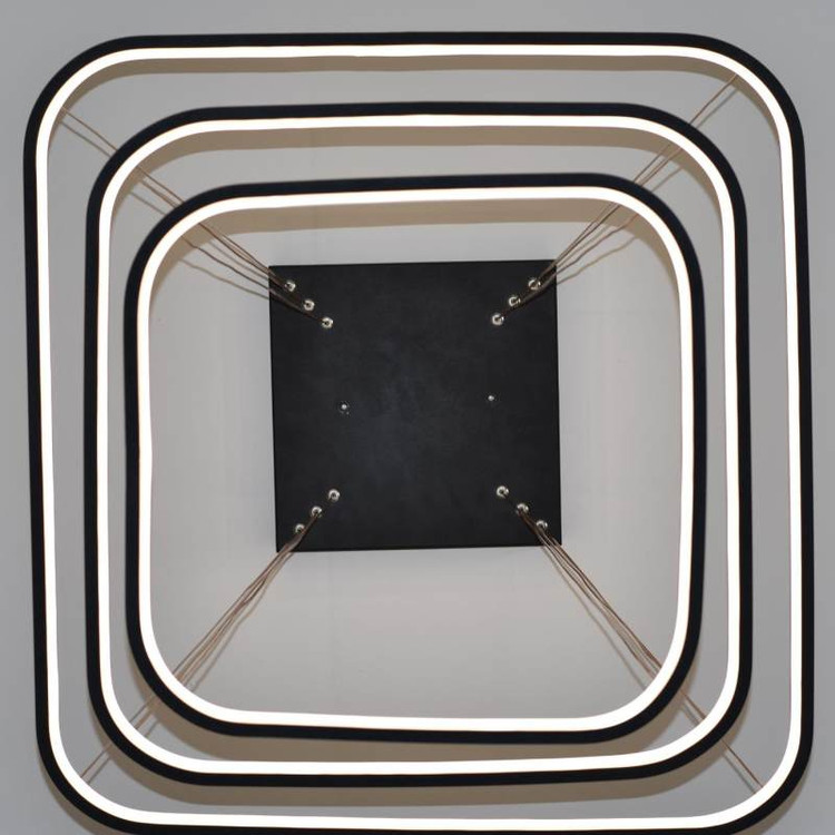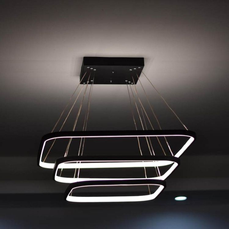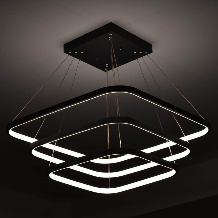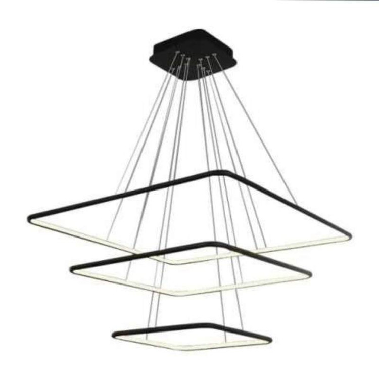 لوستر سه حلقه مربع به ابعاد -40-50-60 سانتیمتر ،رنگ بدنه مشکی مات،در سه نوع (آفتابی ،مهتابی و چند رنگ) ارائه میشود ، دارای ریموت کنترل است و از امکانات ریموت میتوان به کم و زیاد کردن نور ،حالت شب و خاموش روشن کردن نور واپلیکیشن موبایل اشاره کرد