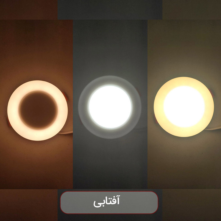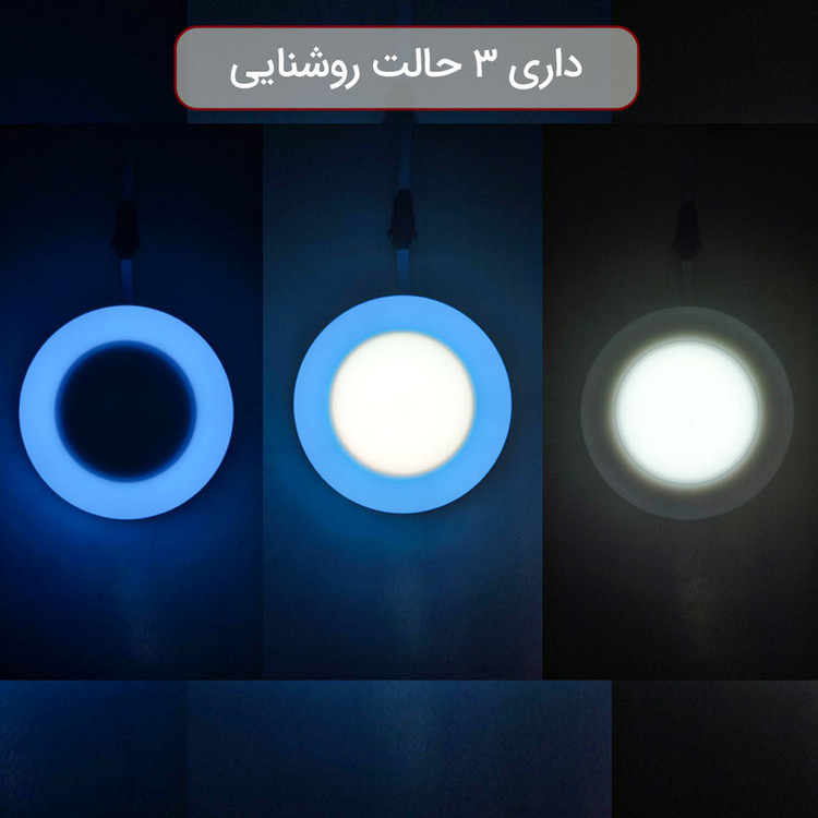 چراغ سقفی ال ای دی توکار پرشین لایت ایران مدل سه حالته 12 وات یکی از بهترین محصولات جدید هالوژنی جهت جایگزینی با انواع قدیمی آن است. نحوه کارکرد این پنل SMD فوق کم مصرف به این حالت است که با هر بار خاموش و روشن کردن کلید روشنایی حالت های نور دهی آن تغییر خواهد کرد و بارزترین ویژگی این پنل خوش ساخت تنوع رنگی در رنگ نور آبی، زرد (آفتابی)، فیروزه ای، انبه ای(طلایی)، و بنفش که دور آن می باشد. در زمان قرار گیری در حالت دوم فقط نور رنگی روشن خواهد شد و حالت نور خواب ملایم به فضای شما هدیه خواهد داد که جایگزین بسیار مناسبی برای نورهای مخفی می باشد و می توانید آن را در شب روشن کرده و از نور یکپارچه آن لذت ببرید. قسمت میانی این چراغ از پنل اج لایت بهره میبرد که نوری یک دست با پوشش دهی بالا را به ارمغان می آورد و ترکیب آن با نور رنگی حلقه ای دورش بسیار زیبا و منحصر به فرد می باشد. استفاده از تکنولوژی SMD در پنل سقفی دور رنگی باعث افزایش طول عمر و بهرهوری پنلها میگردد. پنل سه حالته با قابلیت ایجاد نور در سه حالت، نوری دلپذیر و زیبایی را برای شما به ارمغان میآورد. این پنل سه حالته LED ، با طراحی جدید و کیفیت بالا از یک سو قابلیت تامین روشنایی در حالت عمومی و از سوی دیگر قابلیت روشنایی تزیینی را دارد. پنل سه حالته دارای رنگ ” مهتابی” در داخل و نور رنگی در اطراف آنها میباشند که قابلیت انتخاب این دو رنگ در سه حالت امکانپذیر میباشد. (داخل روشن، بیرون خاموش – بیرون روشن، داخل خاموش – هردو روشن) که با هر بار خاموش و روشن کردن حالت آن عوض خواهد شد.